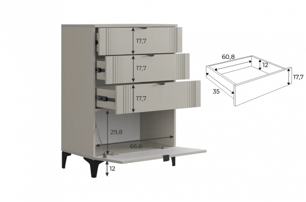 Комод изготовлен из качественных материалов: корпус выполнен из ЛДСП, что гарантирует прочность и долговечность, а фасад, выполненный из МДФ в плёнке ПВХ, не только выглядит эстетично, но и защищает комод от повреждений. Особое внимание заслуживает фрезеровка фасадов, которая придаёт изделию изысканный вид.