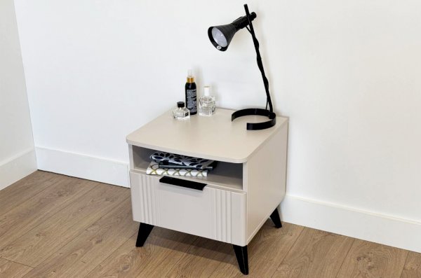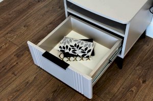 Благодаря компактным размерам тумба легко впишется в любой интерьер и гармонично сочетается с другими модулями спальни «Катрин». Выкатной ящик на шариковых направляющих обеспечивает удобный доступ к вещам, а нерегулируемые пластиковые опоры гарантируют стабильность конструкции.