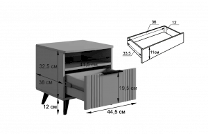 Тумба оснащена стильной ручкой и имеет удобное наполнение: выкатной ящик на шариковых направляющих и открытая ниша для хранения вещей. Это позволяет рационально использовать пространство и разместить различные предметы.